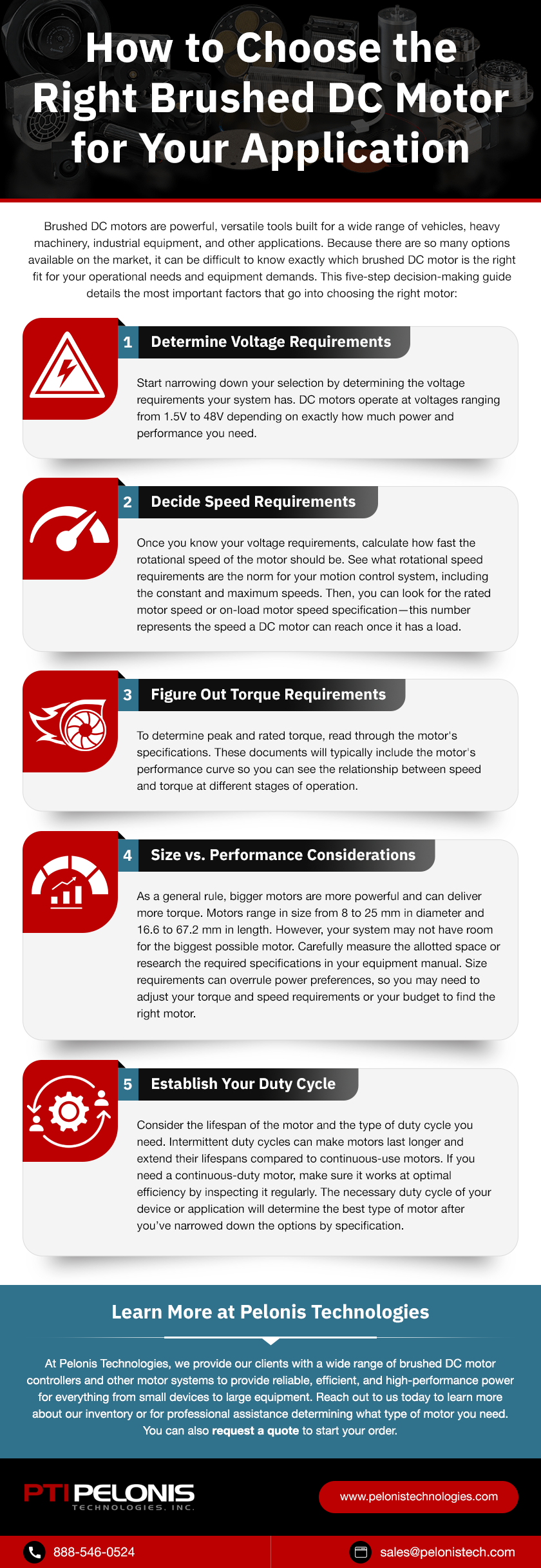 Brushed DC motors are powerful, versatile tools built for a wide range of vehicles, heavy machinery, industrial equipment, and other applications. Because there are so many options available on the market, it can be difficult to know exactly which brushed DC motor is the right fit for your operational needs and equipment demands. This five-step decision-making guide details the most important factors that go into choosing the right motor: