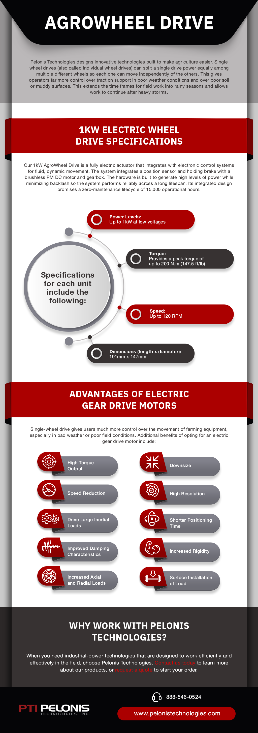 Along with single-wheel drive solutions like the new AgroWheel Drive, Pelonis Technologies also provides specialty motion control systems and motors for use across all major industries. Learn more about the capabilities of the AgroWheel Drive and how it can extend your organization's agricultural capabilities.